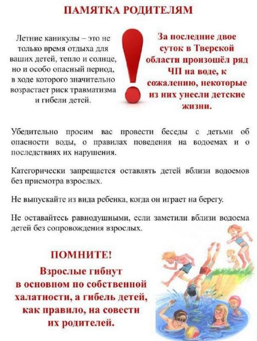 В связи с наступлением жаркой погоды, в целях недопущения гибели детей на водоемах в летний период обращаемся к Вам с убедительной просьбой: провести разъяснительную работу о правилах поведения на природных и искусственных водоемах и о последствиях их нарушения. Этим Вы предупредите несчастные случаи с Вашими детьми на воде, от этого зависит жизнь Ваших детей сегодня и завтра.