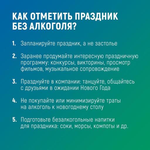 Отметим, что профилактика употребления алкоголя является важной задачей национального проекта «Демография» и способствует укреплению общественного здоровья! Как алкоголь влияет на здоровье человека и как встретить праздник без алкоголя читайте в карточках.