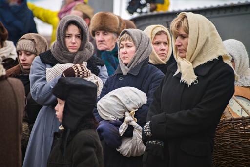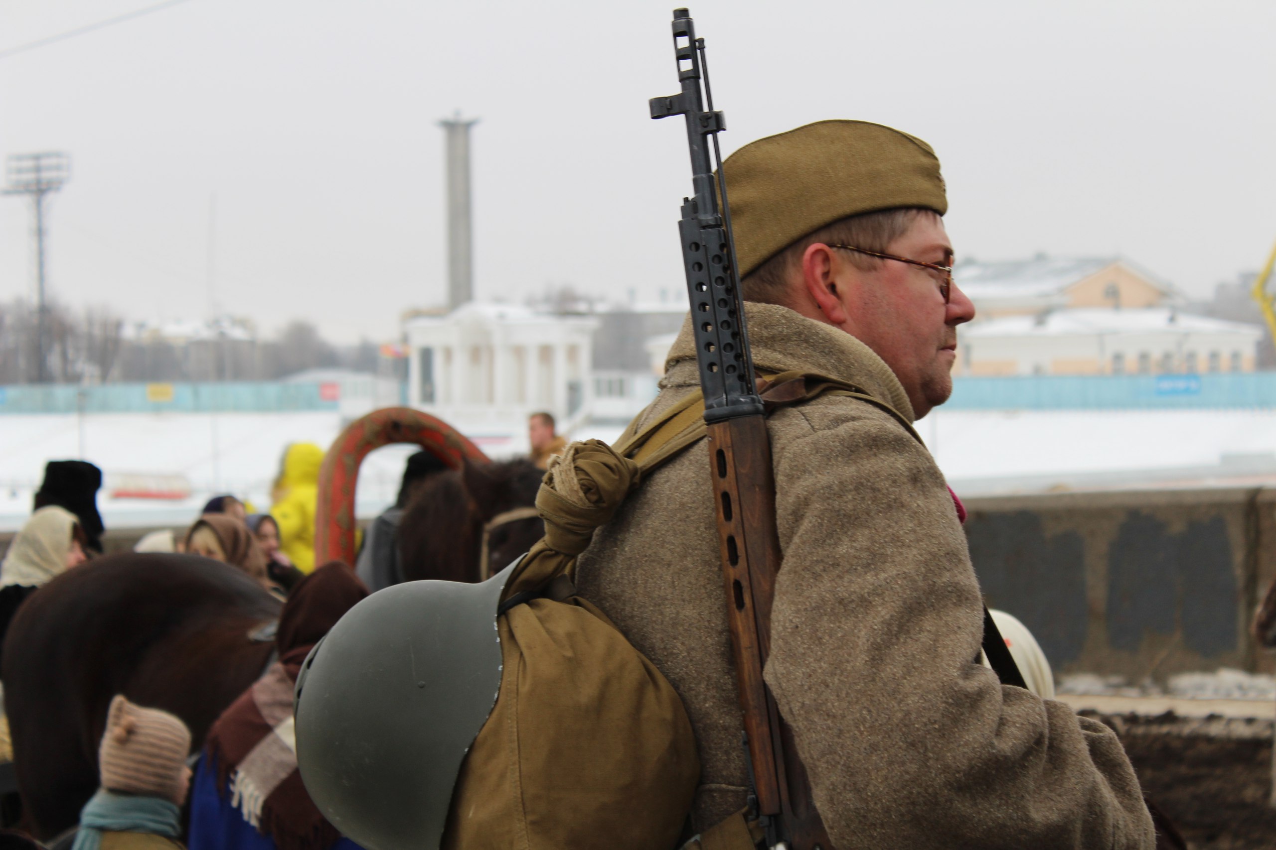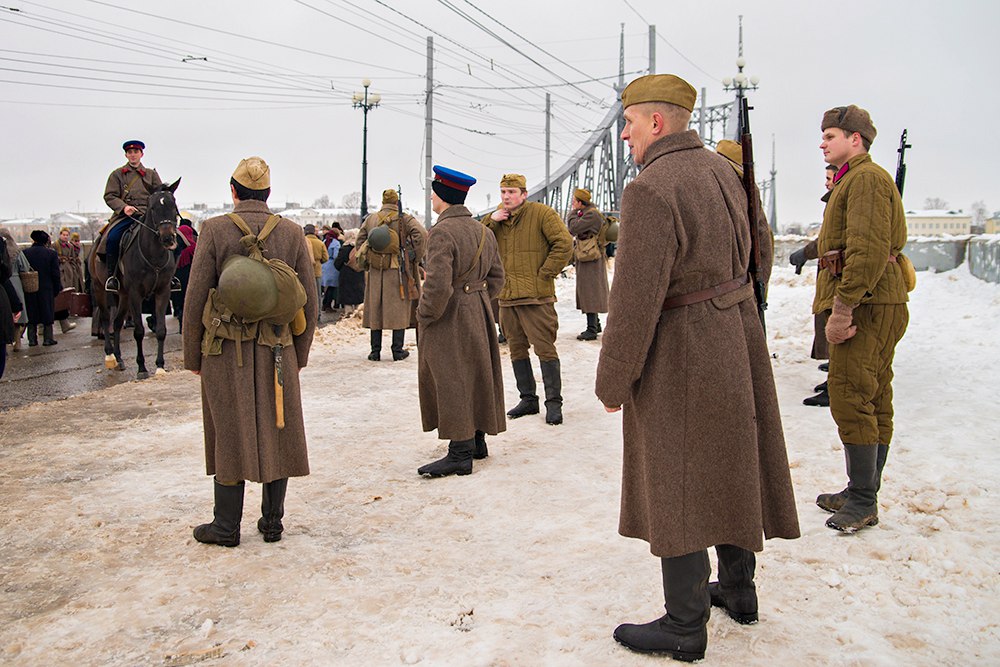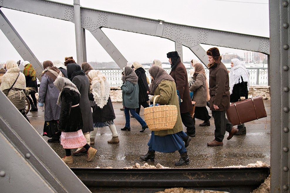 По сценарию жители, спасаясь от подступающих к городу фашистских войск, идут через Староволжский мост. Увешанные котомками и чемоданами, большей частью пешком, иногда на телегах, гружёных скарбом, нестройной толпой шёл гражданский люд. Колонну замыкал отряд красноармейцев, гарцевал на гнедом коне офицер НКВД в синей фуражке.