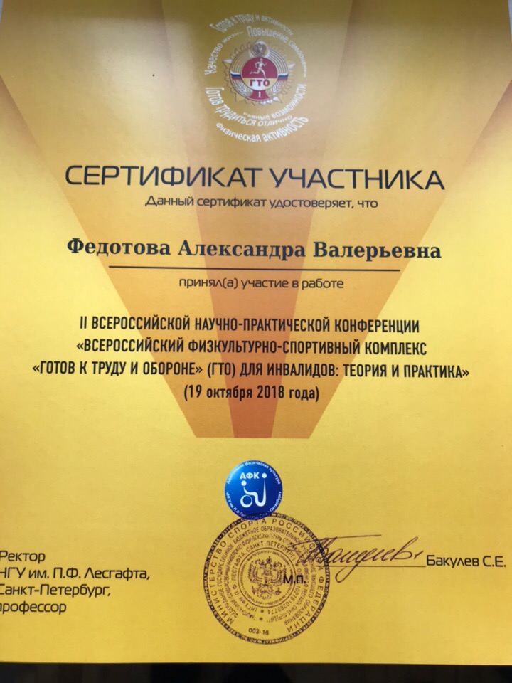 с 18 по 20 октября г. Санкт-Петербурге в национальном государственном университете физической культуры , спорта и здоровья им. П.Ф. Лесгафта прошла Всероссийская научно-практическая конференция ВФСК «Готов к труду и обороне» для инвалидов: Теория и практика» на конференции присутствовали участники организаций и центров ГТО , учреждений спорта, представители администраций руководители спорта со всех регионов России около 500 участников из 40 регионов России.Конференция ВФСК "Готов к труду и обороне" для инвалидов