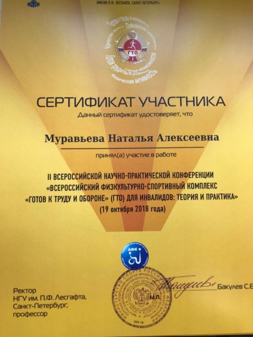 с 18 по 20 октября г. Санкт-Петербурге в национальном государственном университете физической культуры , спорта и здоровья им. П.Ф. Лесгафта прошла Всероссийская научно-практическая конференция ВФСК «Готов к труду и обороне» для инвалидов: Теория и практика» на конференции присутствовали участники организаций и центров ГТО , учреждений спорта, представители администраций руководители спорта со всех регионов России около 500 участников из 40 регионов России.От нашего района да и вообще от всего региона в работе конференции приняли участие заведующий отделом молодежной политики, культуры и спорта администрации Конаковского района А.В. Федотова и руководитель муниципального центра ГТО Н.А. Муравьева.