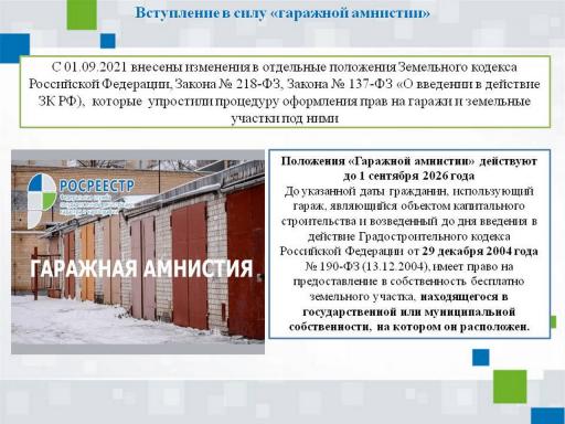 Федеральный закон от 05.04.2021 № 79-ФЗ «О внесении изменений в отдельные законодательные акты Российской Федерации» (закон о «гаражной амнистии») вступил в силу 1 сентября 2021 года. Документ, разработанный при участии Росреестра, призван внести ясность в регулирование вопросов оформления прав на объекты гаражного назначения и земельные участки, на которых они расположены. Положения «гаражной амнистии» действуют до 1 сентября 2026 года.