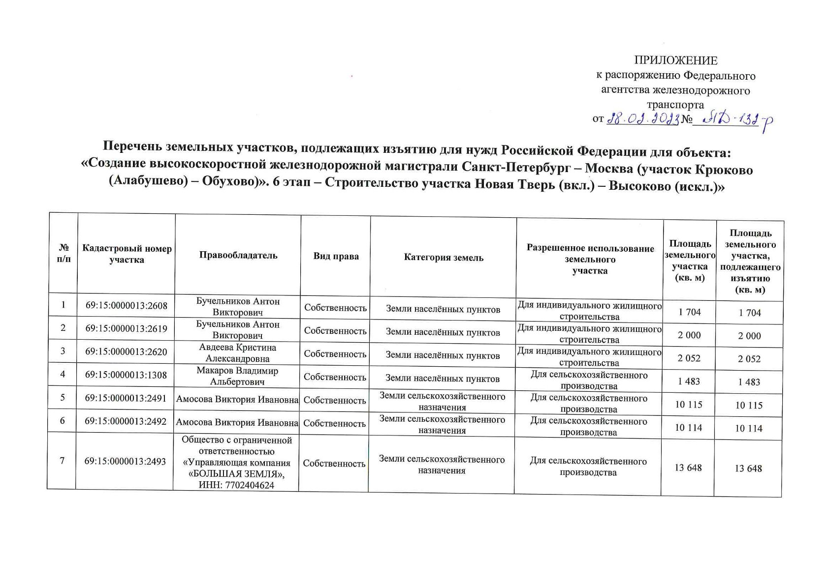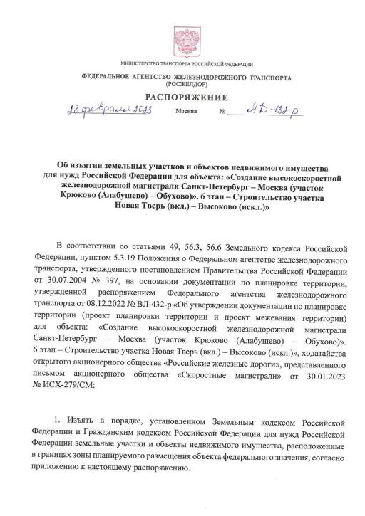 В соответствии со статьями 49, 56.3, 56.6 Земельного кодекса Российской Федерации, пунктом 5.3.19 Положения о Федеральном агентстве железнодорожного транспорта, утвержденного постановлением Правительства Российской Федерации от 30.07.2004 № 397, на основании документации по планировке территории, утвержденной распоряжением Федерального агентства железнодорожного транспорта от 08.12.2022 № ВЛ-432-р «Об утверждении документации по планировке территории (проект планировки территории и проект межевания территории) для объекта: «Создание высокоскоростной железнодорожной магистрали Санкт-Петербург - Москва (участок Крюково (Алабушево) - Обухово)». 6 этап - Строительство участка Новая Тверь (вкл.) - Высоково (искл.)»,