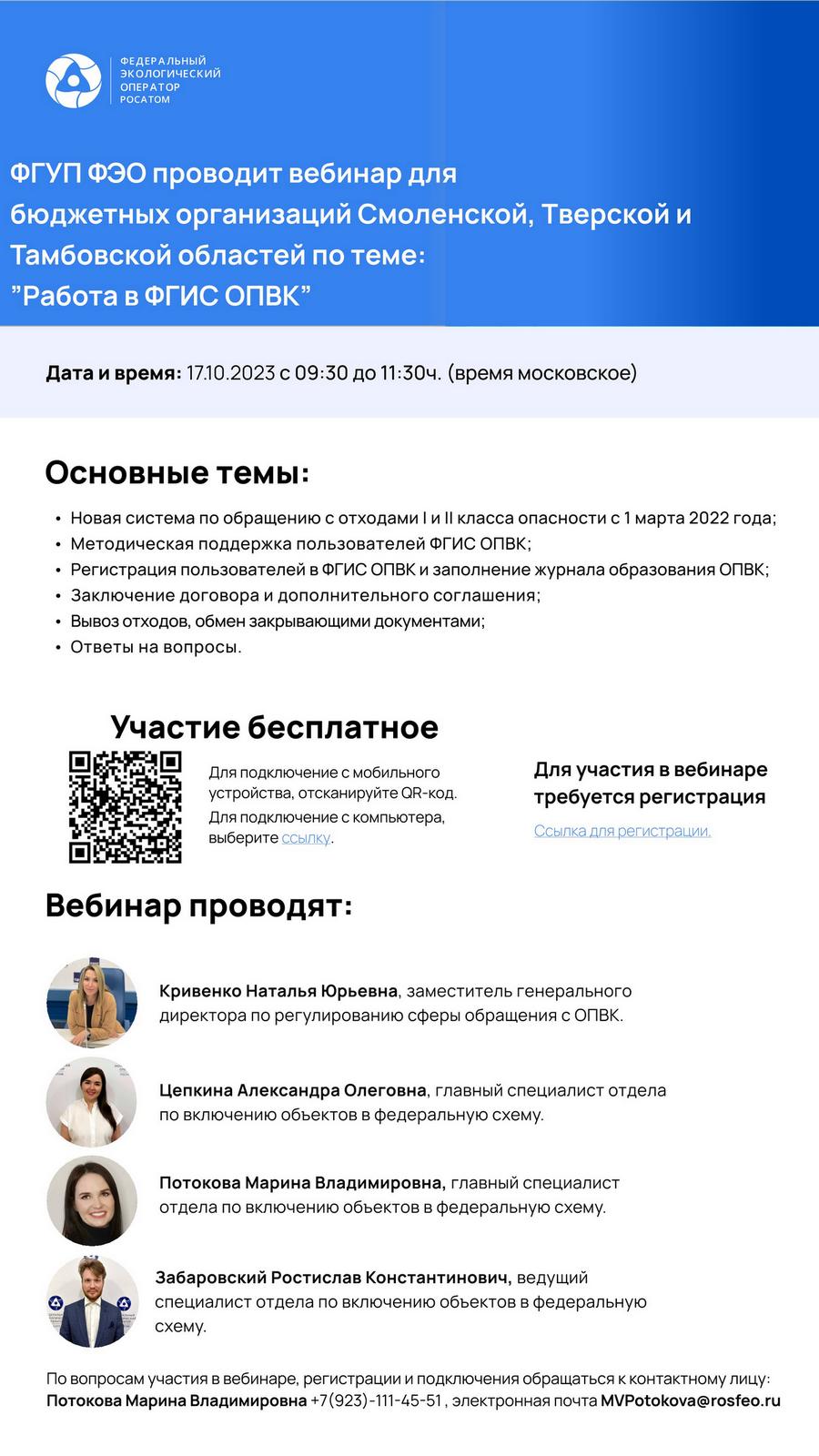 Министерство природных ресурсов и экологии Тверской области информирует о том, что 17 октября 2023 года с 09:30 до 11:30 федеральное государственное унитарное предприятие «Федеральный экологический оператор» (ФГУП «ФЭО») проведет консультационный вебинар для организаций Тверской области по вопросам осуществления деятельности по обращению с отходами I и II классов опасности.