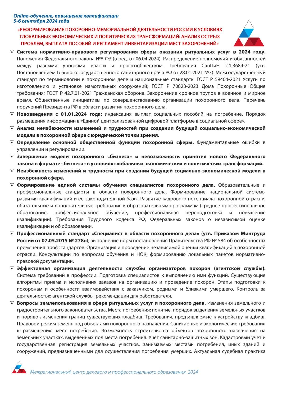 В целях информирования организаций, осуществляющих ритуальнуюдеятельность на территории муниципальных образований Тверской области, Министерство промышленности и торговли Тверской области направляет информацию о проведении межрегиональным центром делового и профессионального образования курса повышения квалификации по теме: «Реформирование похоронно-мемориальной деятельности России в условиях глобальных экономических и политических трансформаций: анализ острых проблем, выплата пособий и регламент инвентаризации мест захоронений», который будет проходить 5-6 сентября 2024 года.