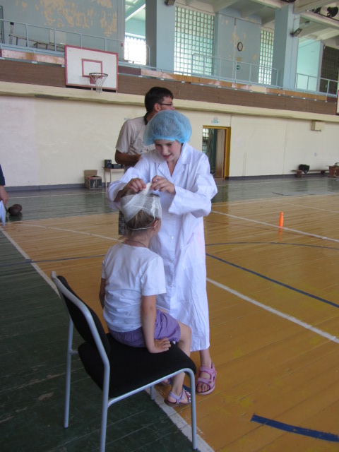 Станция «Скорая помощь» показала, насколько слаженно умеют работать в команде ребята. Здесь нужно было доставить «пострадавшего» в медпункт без носилок, используя подручные средства (кусок ткани), передать его медсестрам, чтобы те, в свою очередь, наложили повязку на «рану».