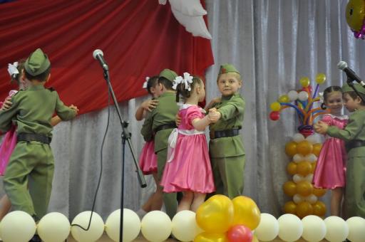 Дети вспоминали о тех, кто подарил им мирное и счастливое детство. Как дань уважения ветеранам со сцены звучала музыка военных и послевоенных лет: «Катюша», «Синий платочек», «Яблочко» (детские сады №3 г.Конаково, №1 с.Селихово, с.Дмитрова Гора). А когда под звуки вальса «Ах, эти тучи в голубом..» на сцену вышли воспитанники детского сада д.Ручьи, зал не мог сдержать слёз, настолько трогательно была представлена маленькими артистами военная история (музыкальный руководитель Кутявина С.В.).