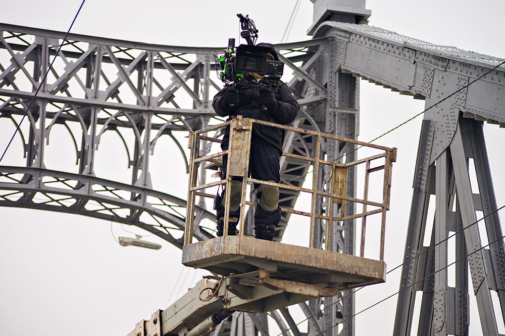 Сцену перехода снимали более 10 раз: сперва общие планы, затем крупные, затем кто-то влезал в кадр в современной одежде и приходилось перенимать дубль.