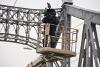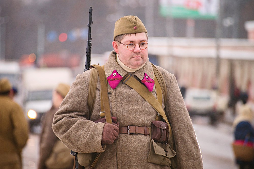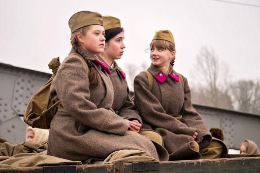 По сценарию жители, спасаясь от подступающих к городу фашистских войск, идут через Староволжский мост. Увешанные котомками и чемоданами, большей частью пешком, иногда на телегах, гружёных скарбом, нестройной толпой шёл гражданский люд. Колонну замыкал отряд красноармейцев, гарцевал на гнедом коне офицер НКВД в синей фуражке.